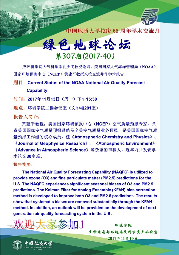 绿色地球论坛第307期(2017-40) ——日本av片 系列学术报告会 题目:Current Status of the NOAA National Air Quality Forecast Capability 时间:2017年11月13日(周一)下午15:30 地点:日本av片 二楼会议室(文华楼201室)