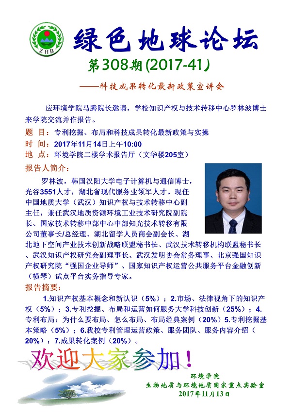 绿色地球论坛第308期(2017-41) ——日本av片 系列学术报告会 题目:专利挖掘、布局和科技成果转化最新政策与实操 时间:2017年11月14日(周二)上午10:00 地点:日本av片 二楼学术报告厅(文华楼205室)