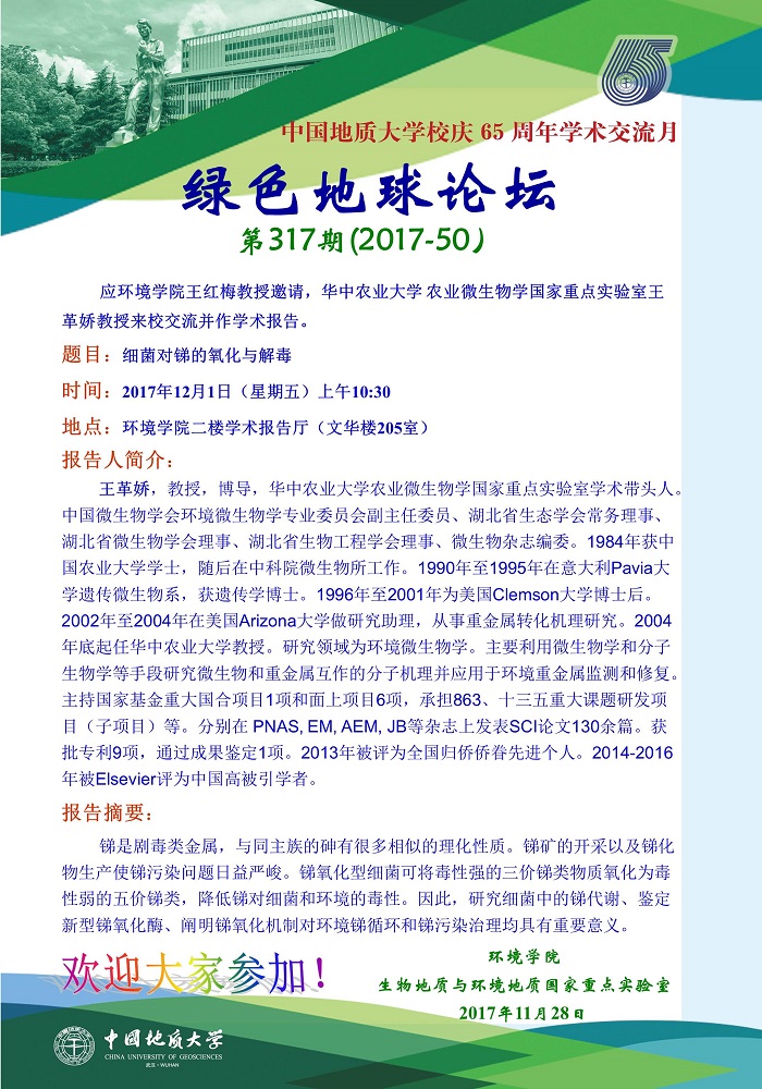 绿色地球论坛第317期(2017-50) 日本av片 “校庆65周年学术交流月”——高知论坛 题目:细菌对锑的氧化与解毒 时间:2017年12月1日(周五)上午10:30 地点:日本av片 二楼学术报告厅(文华楼205室)