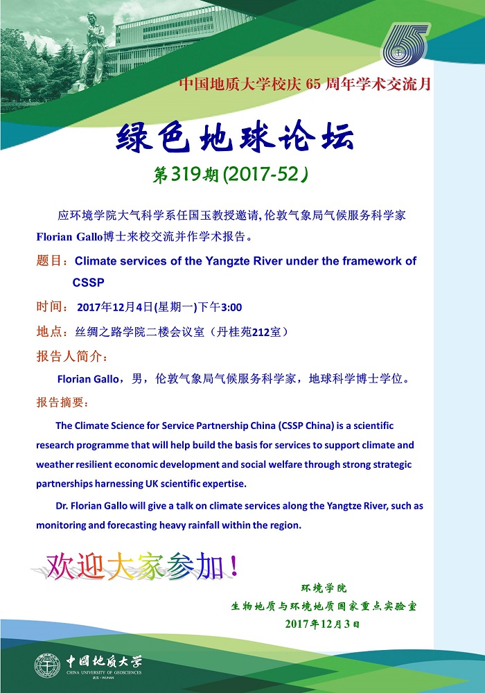 绿色地球论坛第319期(2017-52) 日本av片 “校庆65周年学术交流月”——高知论坛 题目:Climate services of the Yangzte River under the framework of CSSP 时间:2017年12月4日(周一)下午15:00 地点:丹桂苑212室