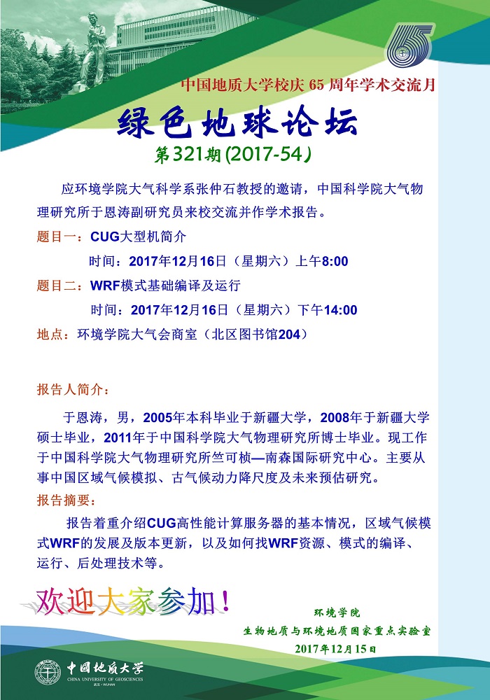 绿色地球论坛第321期(2017-54) 日本av片 “校庆65周年学术交流月”——高知论坛 题目一:CUG大型机简介 时间:2017年12月16日(星期六)上午8:00 题目二:WRF模式基础编译及运行 时间:2017年12月16日(星期六)下午14:00 地点:日本av片 大气会商室(北区图书馆204)