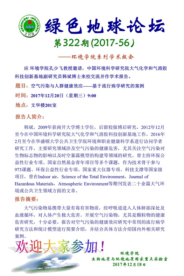 绿色地球论坛第322期(2017-56)——日本av片 系列学术报告会 题目:空气污染与人群健康效应——基于流行病学研究的案例 时间:2017年12月20日(星期三) 上午9:00 地点:文华楼201室