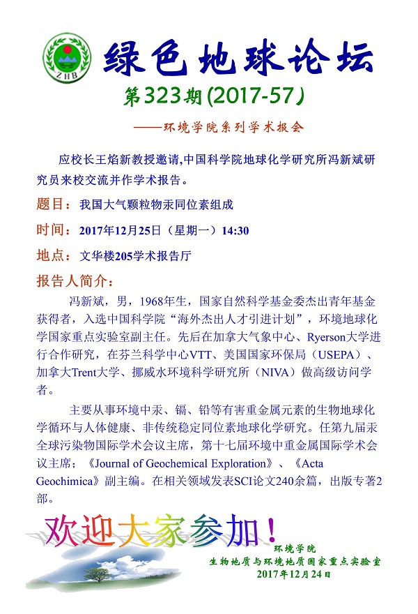 绿色地球论坛第323期(2017-57)——日本av片 系列学术报告会 题目:我国大气颗粒物汞同位素组成 时间:2017年12月25日(星期一)下午14:30 地点:文华楼205学术报告厅