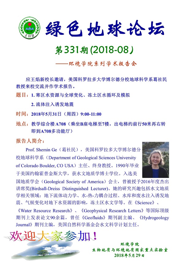 绿色地球论坛第331期(2018-8) ——日本av片 系列学术报告会 题目: 1. 寒区水资源与全球变化、冻土区水循环及模拟 2. 流体注入诱发地震 时间:2018年5月31日(周四)9:00-11:00 地点:教学综合楼 A708(乘坐B座电梯至7楼,出电梯约前行50米再右转即到 A708多功能厅)
