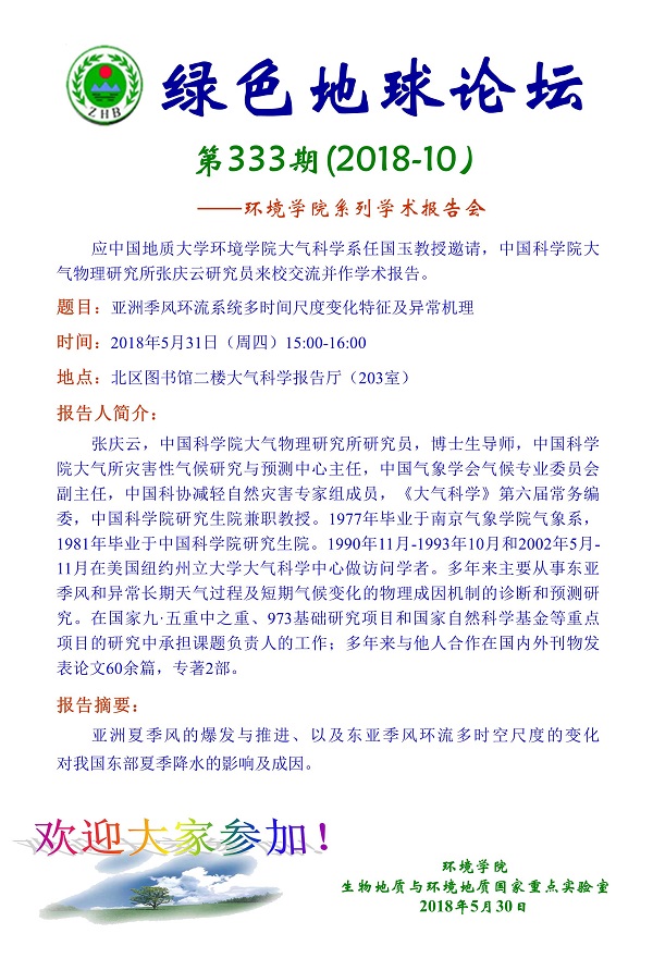 绿色地球论坛第333期(2018-10) ——日本av片 系列学术报告会 题目:亚洲季风环流系统多时间尺度变化特征及异常机理 时间:2018年5月31日(周四)15:00-16:00 地点:北区图书馆二楼大气科学报告厅(203室)