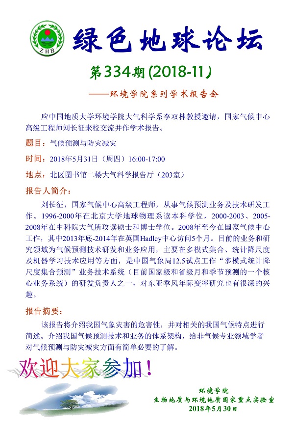 绿色地球论坛第334期(2018-11) ——日本av片 系列学术报告会 题目:气候预测与防灾减灾 时间:2018年5月31日(周四)16:00-17:00 地点:北区图书馆二楼大气科学报告厅(203室)