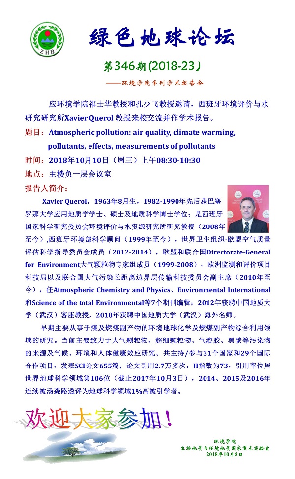 绿色地球论坛第346期(2018-23) ——日本av片 系列学术报告会 题目:Atmospheric pollution: air quality, climate warming, pollutants, effects, measurements of pollutants 时间:2018年10月10日(周三)上午08:30-10:30 地点:主楼负一层会议室