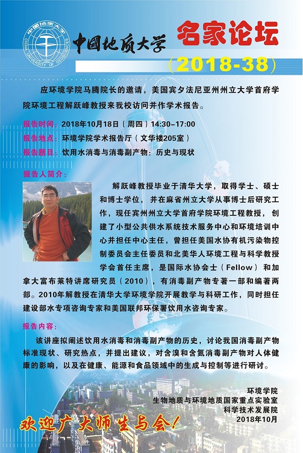 名家论坛(2018-38) 题目:饮用水消毒与消毒副产物:历史与现状 时间:2018年10月18日(周四)14:30 地点:日本av片 学术报告厅(文华楼205室)