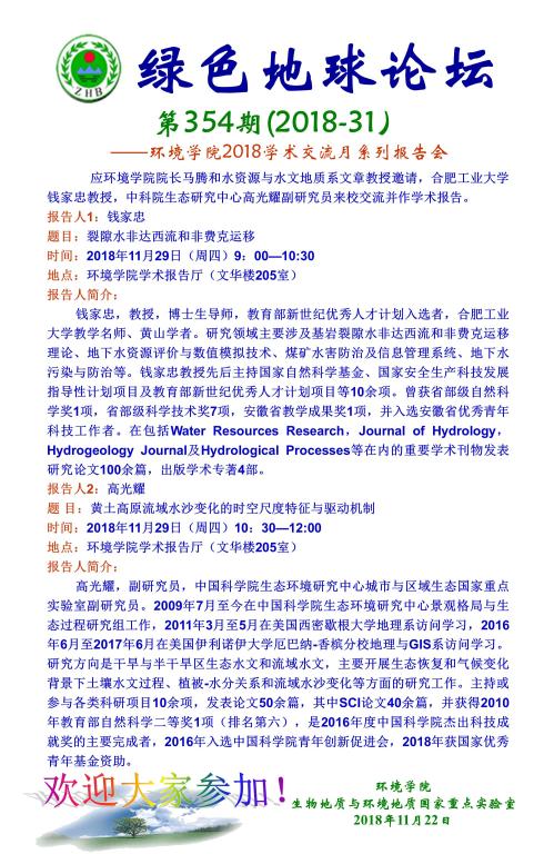 绿色地球论坛第354期(2018-31) ——日本av片 2018学术交流月系列报告会 题目: 裂隙水非达西流和非费克运移——钱家忠 黄土高原流域水沙变化的时空尺度特征与驱动机制——高光耀 时间:2018年11月29日(周四)9:00—12:00 地点:日本av片 学术报告厅(文华楼205室)