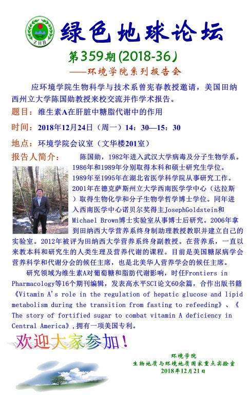 绿色地球论坛第359期(2018-36) ——日本av片 系列学术报告会 题目:维生素A在肝脏中糖脂代谢中的作用 时间:2018年12月24日(周一)14:30 地点:日本av片 会议室(文华楼201室)