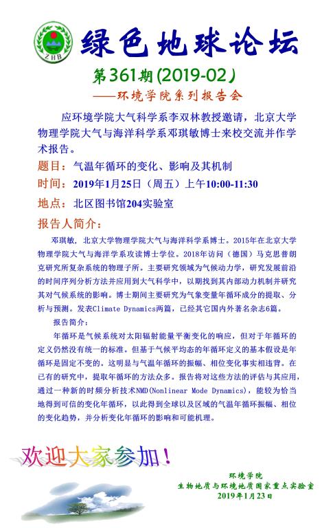 绿色地球论坛第361期(2019-02) ——日本av片 系列学术报告会 题目:气温年循环的变化、影响及其机制 时间:2019年1月25日(周五)10:00—11:30 地点:北区图书馆204实验室
