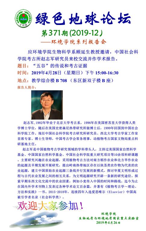 题目:“五谷”的传说和考古证据 时间:2019年4月28日(星期日)下午15:00—16:30 地点:教学综合楼 B 708 (东区新双子楼 B 座)