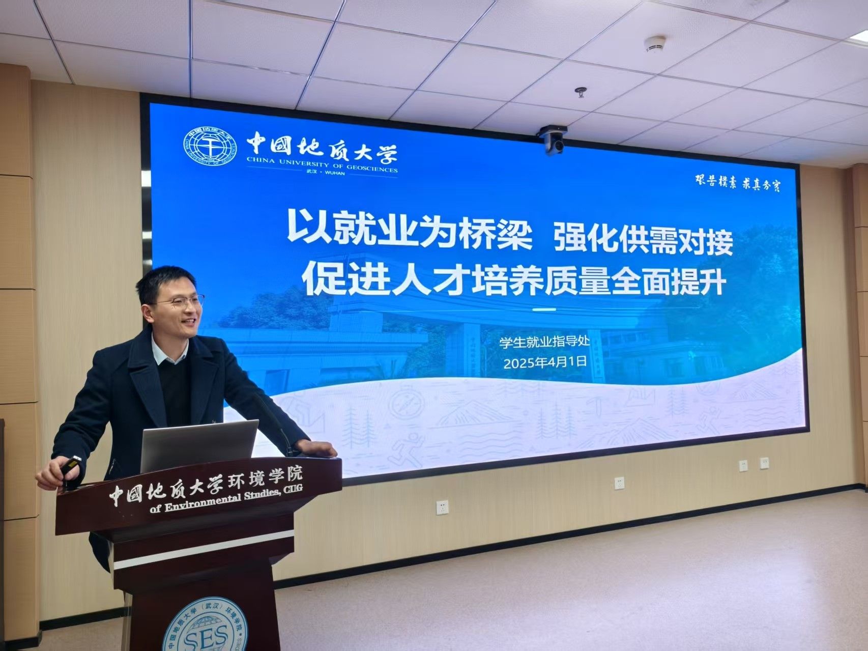 孟国强从“当前就业形势、新时代就业工作的新使命与新定位、加快建设高质量就业服务体系”三方面深入讲解学校整体就业工作情况。他结合毕业生和用人单位反馈情况,指出用人单位最看重学生实习实践经历,希望毕业生丰富自身经历,不怕失败,大胆且精准投递简历。他介绍学校高质量就业服务体系建设情况,希望同学们善用学校资源,提升求职能力。