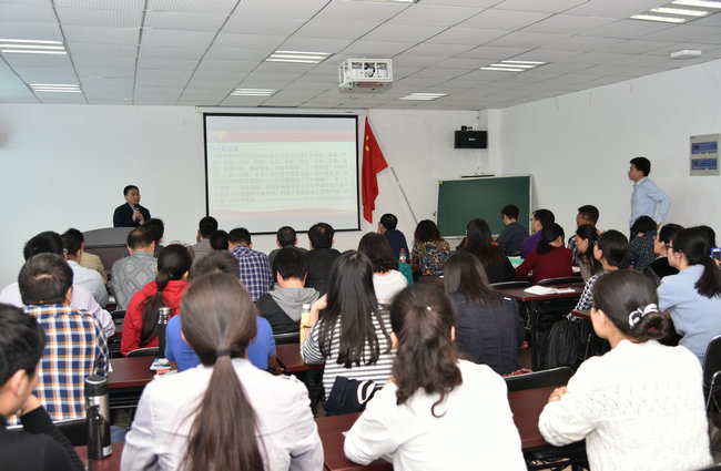 学院党委书记李素矿以《知行十九大精神 履行立德树人之职》为题,结合自身学习体会心得,运用核心概念关键词方法对党的十九大报告进行了重点学习解读。他指出,习近平总书记的报告,深刻回答了新时代坚持和发展中国特色社会主义的一系列重大理论和实践问题,描绘了决胜全面建成小康社会、夺取新时代中国特色社会主义伟大胜利的宏伟蓝图,进一步指明了党和国家事业的前进方向,是全党全国各族人民智慧的结晶,是我们党团结带领全国各族人民在新时代坚持和发展中国特色社会主义的政治宣言和行动纲领,是马克思主义的纲领性文献。