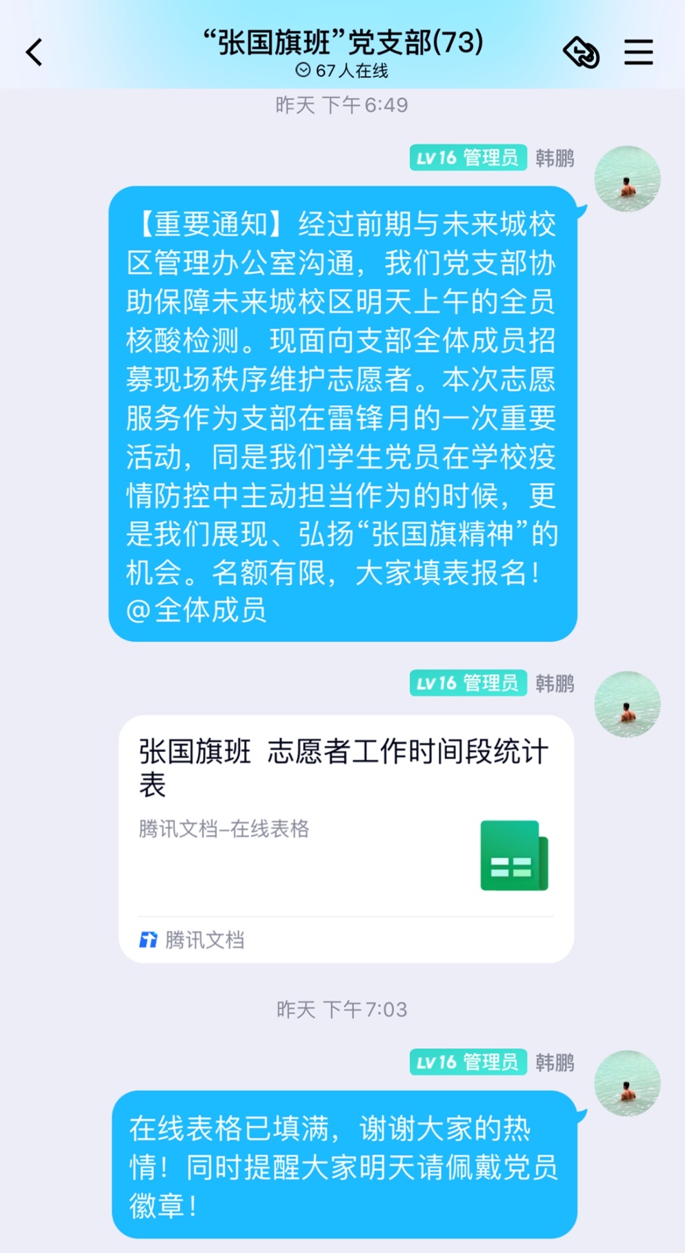 “张国旗班”党、团支部获悉3月4日学校进行全员核酸检测这一消息后,第一时间主动请缨,在党委研工部和学院党委的大力支持下、院团委的具体指导下,以志愿服务的形式协助未来城校区管理办公室做好未来城校区全员核酸检测工作。恰逢雷锋精神学习月,“张国旗班”志愿团以“党团联动,致敬雷锋同志”的名义发布志愿者募集通知后,短短片刻,申请人数就远超预定招募人数。
