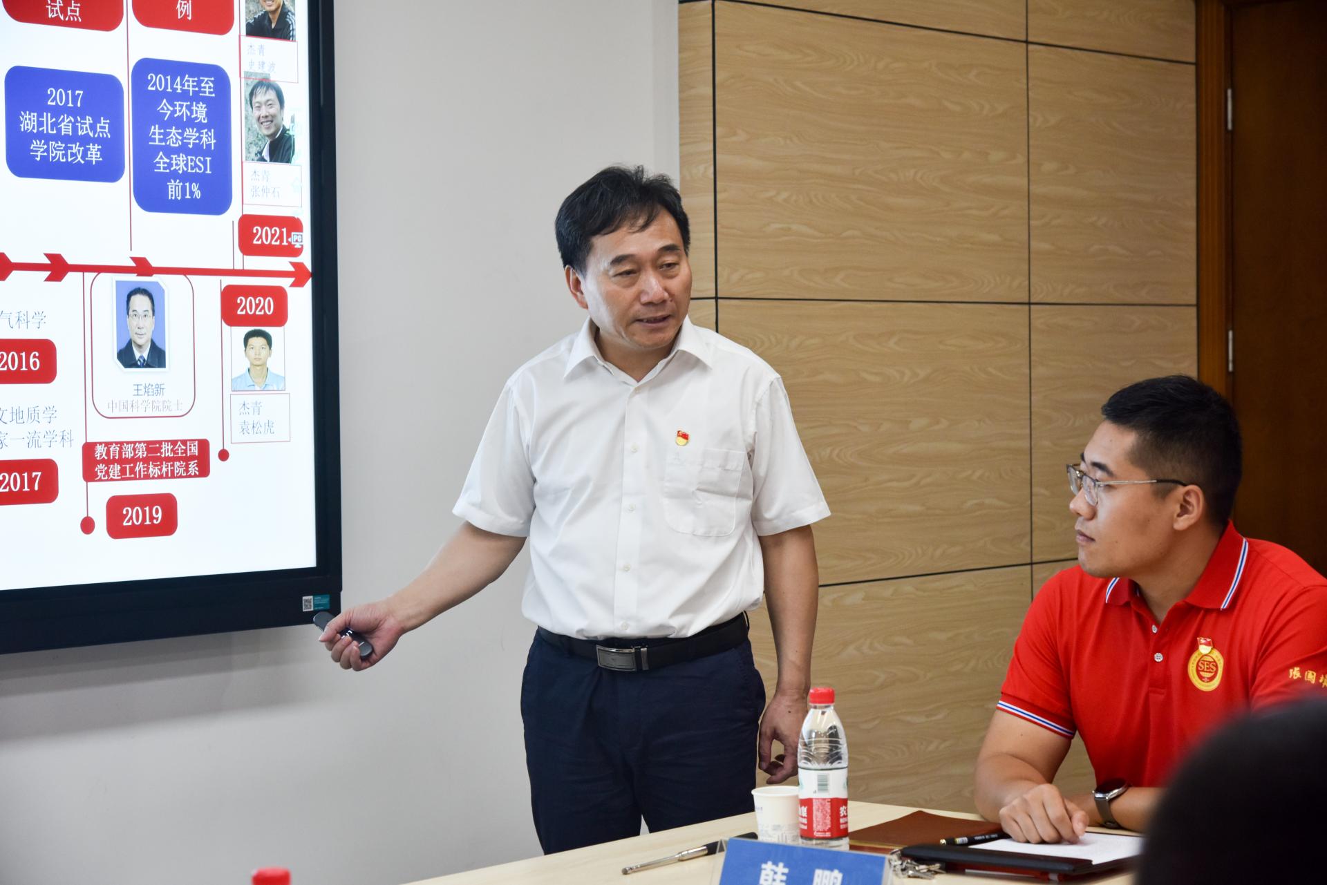 ,重点从谋划“红专能优”党建育人模式、实施“张国旗班”行动计划、涵养“1+6”资政育人氛围、建设“美丽中国”4+N课程思政、打造水-土-气-生-环跨学科育人范式等5个“双创”举措进行了党建“双创”工作分享。他说,学院党建示范创建和质量创优工作所取得的创新性理论成果、制度成果、实践成果和特色成果,是全体师生凝心聚力、干事创业、追求卓越的汗水结晶。