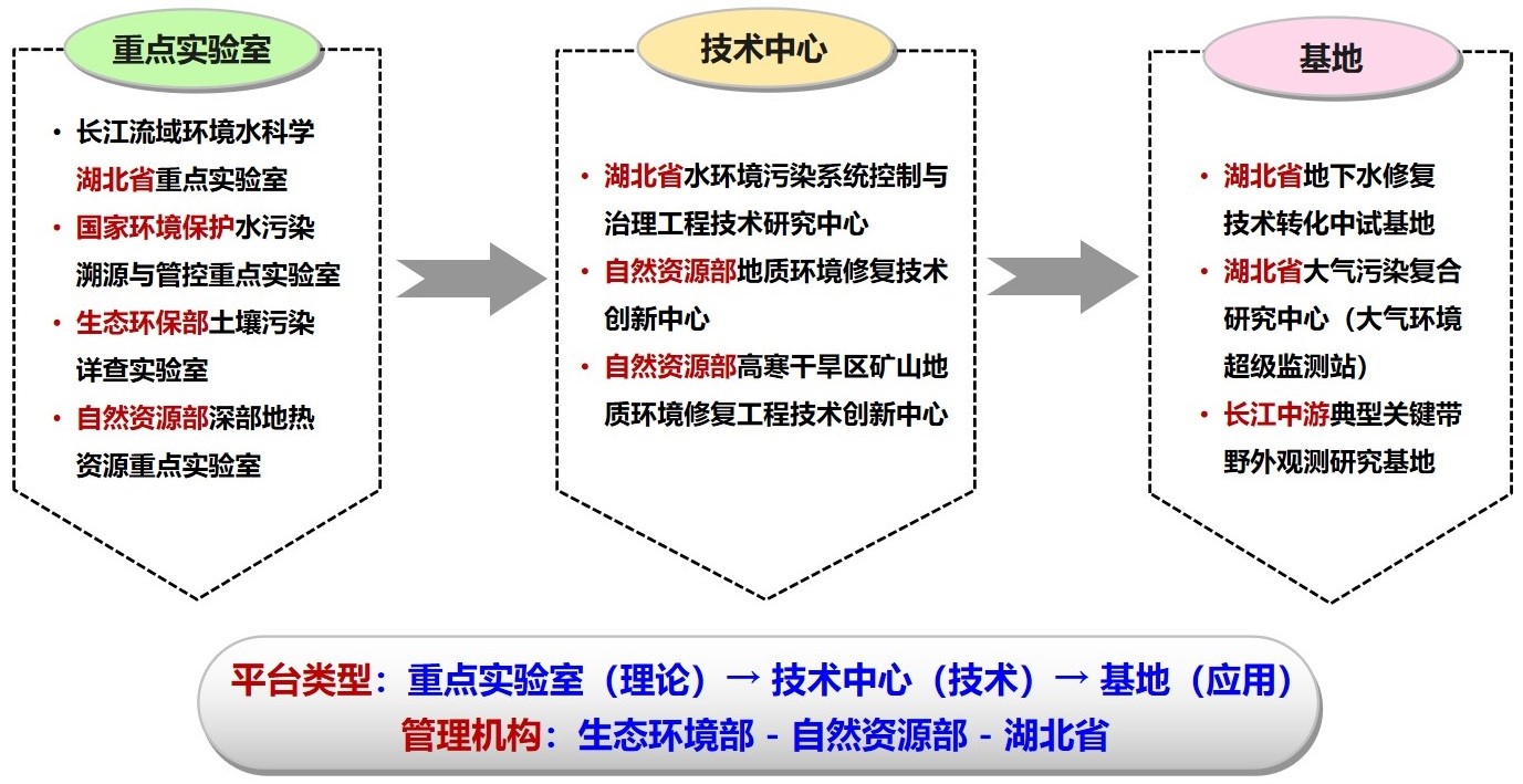 目前,以学院为主体建设的省部级科研平台包括:国家环境保护水污染溯源与管控重点实验室、长江流域环境水科学湖北省重点实验室、自然资源部地质环境修复技术创新中心、湖北省水环境污染系统控制与治理工程技术研究中心、湖北省地下水修复技术转化中试基地、生态环境部土壤污染状况详查检测实验室。学院参与共建的省部级科研平台包括:湖北省大气污染复合研究中心、中国气象局极端天气气候与水文地质灾害研究中心、自然资源部高寒干旱区矿山地质环境修复工程技术创新中心、湿地演化与生态恢复湖北省重点实验室、深部地热资源自然资源部重点实验室、自然资源部矿山生态效应与系统修复重点实验室。